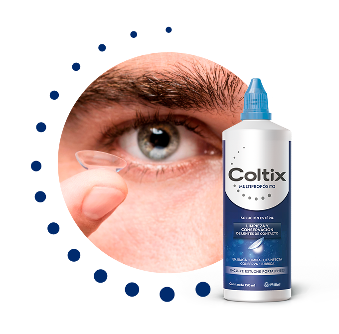 Luego colóquelo en la palma de su mano. Aplique por lo menos 3 gotas de Coltix Multipropósito en la superficie del lente.